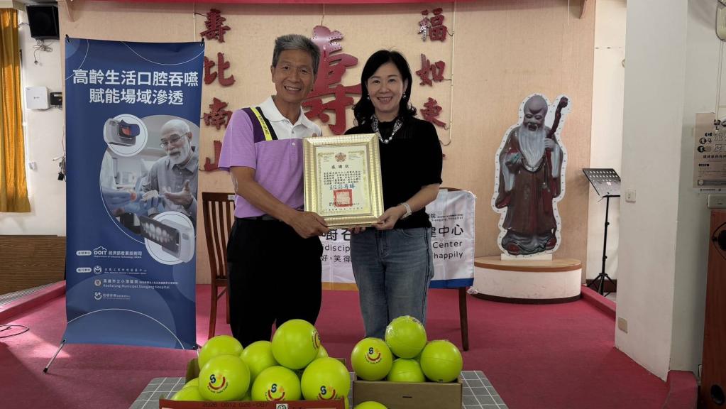 本次活動中,小港醫院特別致贈「下巴阻抗運動球」供住民持續訓練,用於訓練舌骨上肌群,以改善吞嚥功能,減少嗆咳;下巴阻抗運動球是透過將約10公分直徑彈力球夾在下巴下方,進行等長收縮(夾住10秒)或等張運動(重複擠壓10次)等,能增強吞嚥肌力;現場並由小港醫院語言治療師王奕樺示範正確操作方式,使復能訓練得以延伸與深化,透過持續練習,有助長者維持吞嚥能力與口腔功能,降低進食風險,享受美食吃到老。