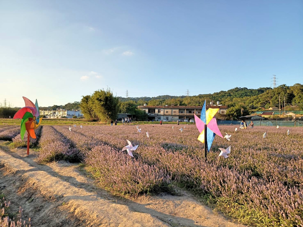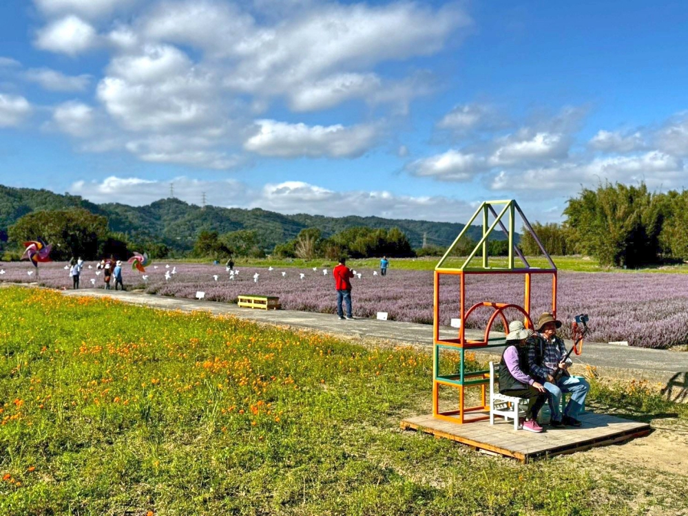 竹縣府農業處表示,今年首度設置兩大主題裝置藝術,〈風吹花動〉結合風車與花田的創意構想,風起時成片風車與花朵同時搖曳,宛如流動的花之海;〈時光角落〉則位於花田中央,以木質課桌椅與積木素材搭建,呈現懷舊又童趣的「時光感」場景,彷彿把童年的教室搬進花田。