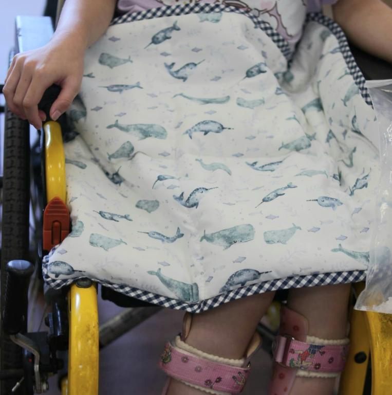 當日參與重量毯手作小光爸爸,是全場最先完成重量毯縫製家長,一雙長年工作曬黑與磨出繭的手,柔和與平順梳理著布料與針線,為的就是將這份手作溫度,傳遞給在旁陪伴與等候的女兒;重量毯縫製完成後,小光爸爸輕輕將重量毯鋪在坐輪椅女兒雙腿上,女兒則也輕輕的將重量毯抱在胸前,輕道對爸爸感謝。