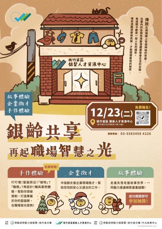 ▲桃竹苗分署將於12月23日在銀髮人才資源中心舉辦「銀齡共享-再起職場智慧之光」活動,求職民眾可在現場與企業面談、求職。同時,現場安排職務再設計的案例分享及輔具體驗,有效延續資深人才的職涯並發揮其專業價值。(圖/ 桃竹苗分署提供)