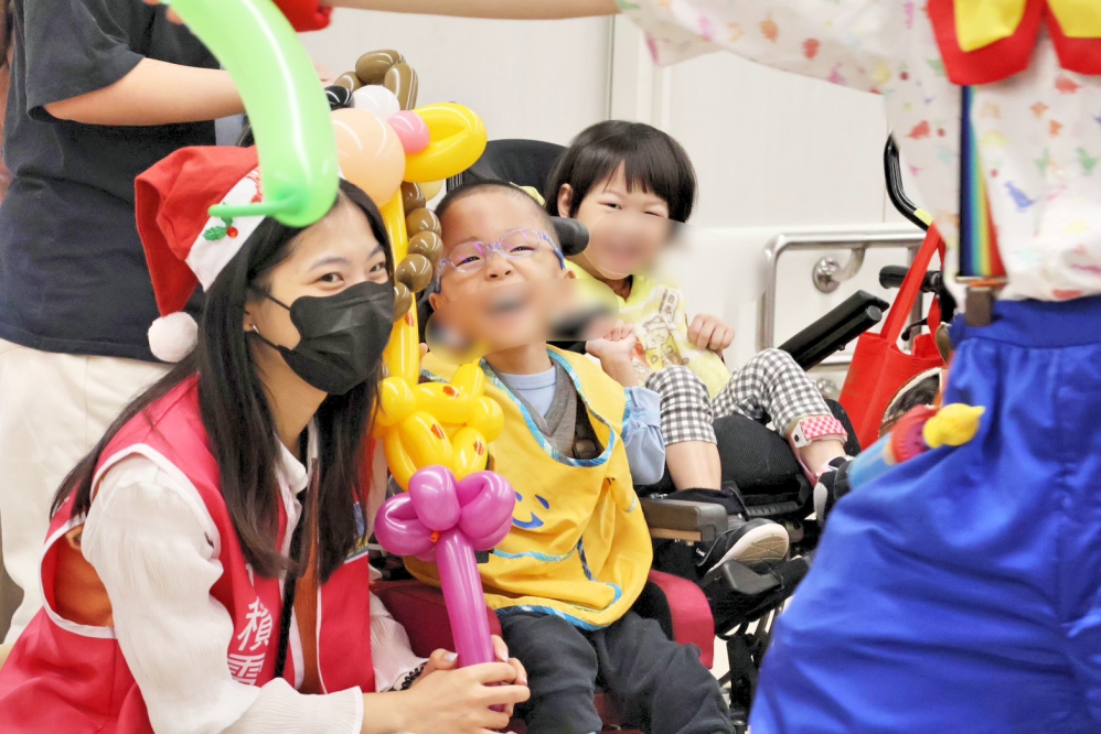 ▲台積電志工陪伴孩子一起開心看汽球表演。(圖/心路基金會提供)