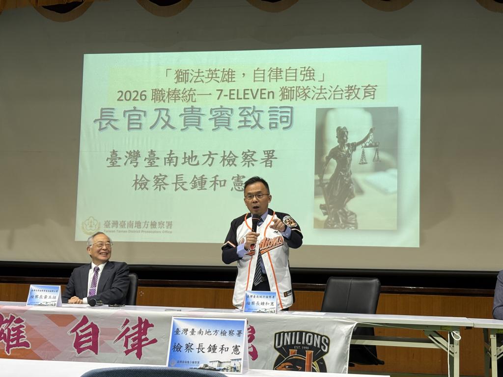 【大成報記者于郁金/臺南報導】臺南地檢署依循法務部及運動部政策指示,並適逢今年為該署與中華職棒統一獅球隊合作進行法律宣導第20年,特於1月13日上午在9樓大禮堂,舉辦「獅法英雄 自律自強2026中華職棒統一獅隊法治教育」;由鍾和憲檢察長親自主持,邀請臺灣高等檢察署臺南檢察分署黃玉垣檢察長、臺灣臺南地方法院陳本良法官蒞臨指導;中華職棒大聯盟由王惠民副秘書長與統一獅隊蘇泰安總經理親自率統一獅隊全體隊職員參加,並有臺南市政府警察局、臺南市政府衛生局均派員共襄盛舉。