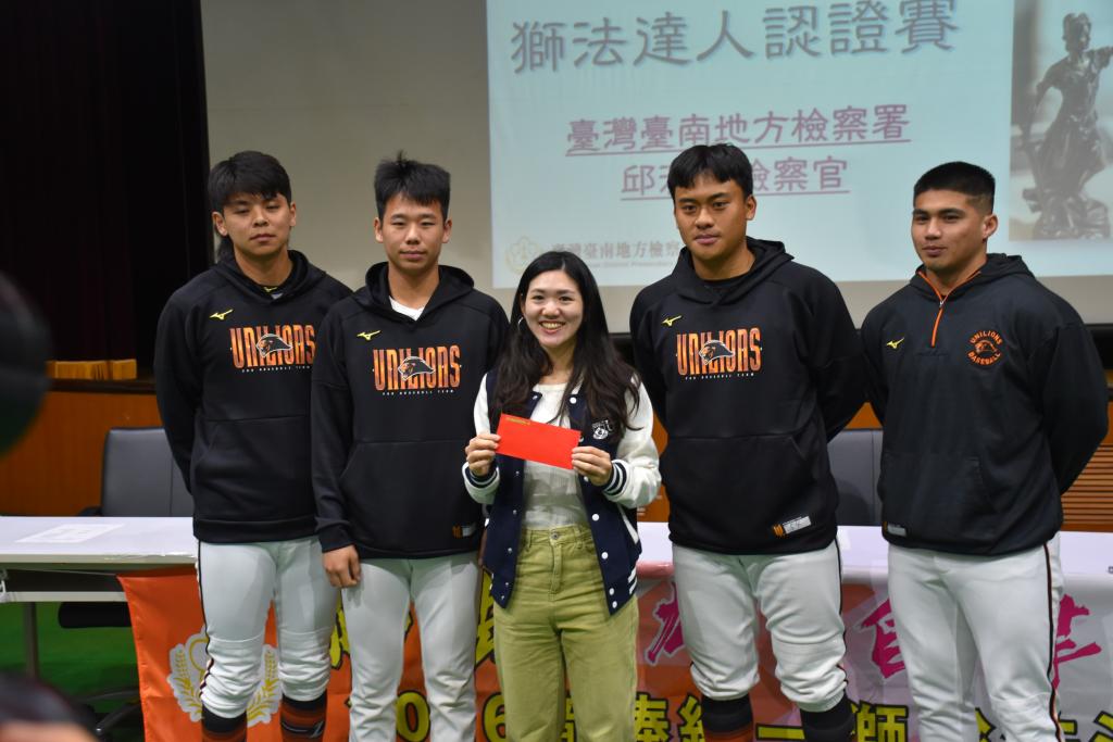 臺南地檢署表示,本署長年舉辦職棒法治教育及參與監賽,希望提供職業球員重要法律基本觀念,及維護公平、公正職棒賽事;此次指派王聖豪及錢鴻明主任檢察官共同主持,並由許華偉、李佳潔、邱瀞慧、楊振岳4位檢察官,以性別平等、打擊詐欺、反毒、拒賭等議題,用「獅法達人認證賽」之分組搶答並輔以檢察官解說方式為法治教育,讓職棒球員除了在球場上賣力表現外,認知到正確法律觀念。