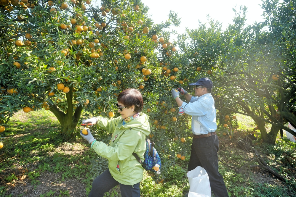 ▲八德榮家辦理「橘香迎新年.寶山採果樂」活動,榮家園藝社社員夫妻倆看到滿山滿谷的柑橘,樂陶陶的表示要採回去給其他住民長輩一起共享美果。(圖/八德榮家提供)