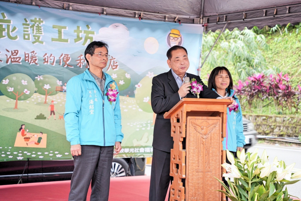 ▲由財團法人天主教華光社會福利基金會與全家便利商店合作設立的磊質庇護工坊(全家華光店)啟用儀式,竹北市長鄭朝方致詞。(圖/華光社會福利基金會提供)