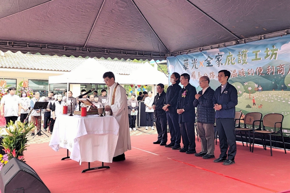 ▲由財團法人天主教華光社會福利基金會與全家便利商店合作設立的磊質庇護工坊(全家華光店)啟用儀式,先由華光社會福利基金會董事長徐森義帶領現場貴賓與同仁進行天主教祝福儀式。(圖/華光社會福利基金會提供)