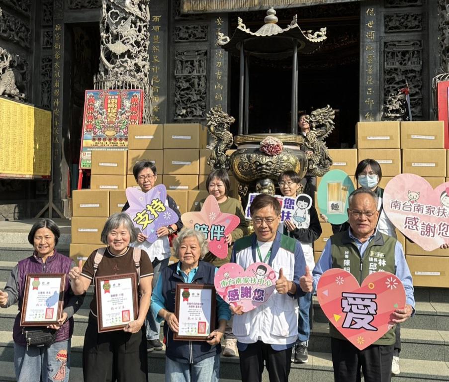 【大成報記者于郁金/臺南報導】台南市南廠保安宮與議長邱莉莉服務處等,共同號召信眾及善心人士,募集淳新金讚刀削麵1880包(共重1128公斤),捐贈給家扶基金會南台南家扶中心,為寒冬中送來一股暖流;19日早上10時在南廠保安宮舉行捐贈儀式,南家扶中心主任李保良出席參與捐贈儀式,感謝各界關懷支持家扶兒。