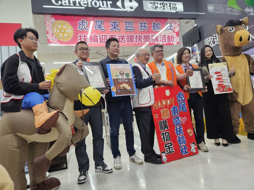 【大成報/雲林報導】歡喜「馬」上購、幸福「馬」Happy,虎尾東區扶輪社連續12年舉辦「社區扶輪日:HappyGo迎春送暖快樂購」活動,由王慶樟社長率領超過40位社友及寶眷,陪伴雲林家扶30戶親子、每戶3,000元在家樂福虎尾店幸福大採購;雲林家扶社工更變身「吉祥馬」陪伴採買,讓家庭在輕鬆、安心氛圍備齊所需物資,感受社會支持與祝福,為新的一年注入希望與力量。