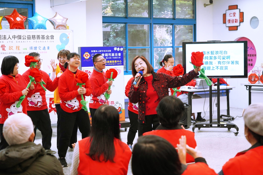▲知名歌手周雅芳與仁愛學員合唱〈心花一朵朵〉,現場互動熱烈。(圖/竹市天主教仁愛基金會提供)