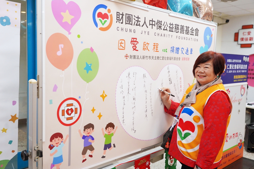 ▲財團法人中傑公益慈善基金會中傑公益慈善基金會劉何玉鈴董事長將祝福寫在簽名板上。(圖/竹市天主教仁愛基金會提供)