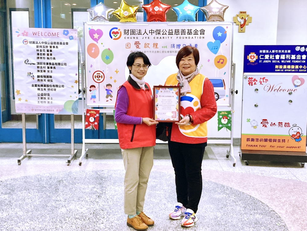 ▲財團法人中傑公益慈善基金會愛心捐贈八人座交通車儀式,仁愛基金會陳素雲主任(左)回贈感謝狀。(圖/竹市天主教仁愛基金會提供)