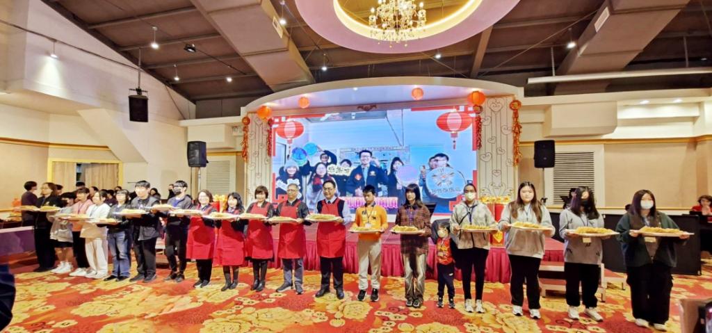 ▲新竹榮服處盛大「迎春納福團圓宴」相見歡暨圍爐活動,特別安排「瑞馬迎春」感恩上菜秀,由新竹榮服處處長鞠宗顯(右7)帶領同仁及學子,親手將象徵團圓的首道佳餚端上桌,象徵著榮服處將服務送到每位榮民眷手中的承諾與熱忱。(圖/新竹榮服處提供)