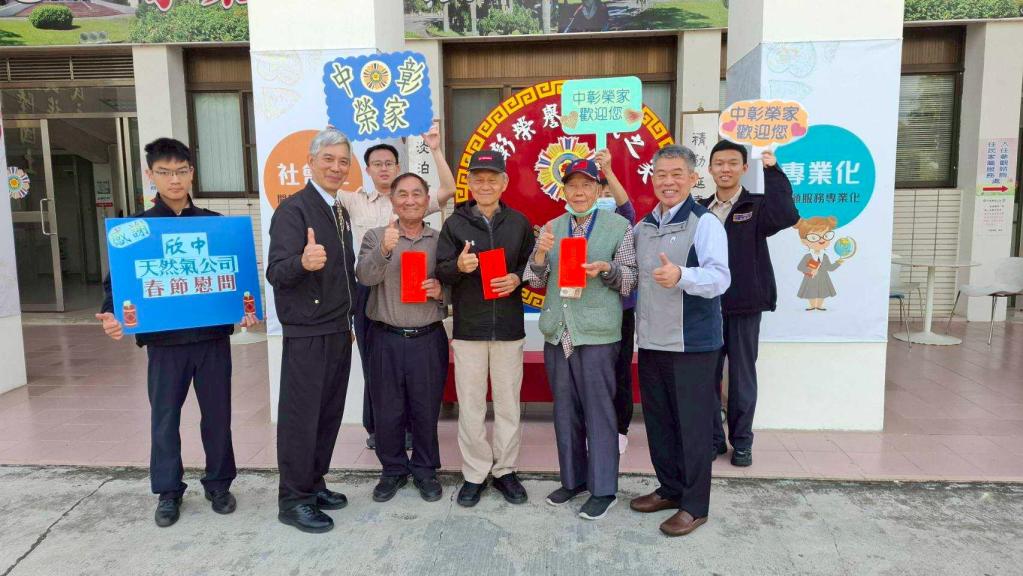 【大成報/彰化報導】農曆春節將屆,為傳遞年節祝福與社會關懷,欣中天然氣公司由王紹華總經理率領團隊,蒞臨中彰榮家進行春節慰問,代表公司捐贈春節慰問金及禮券,向榮家住民長輩表達誠摯關懷與祝福;捐贈儀式於榮家最具代表性「中正堂」溫馨舉行,由長輩代表接受致贈,現場由陪同長輩手持紅色春聯一起合影,更顯濃濃年節氛圍。