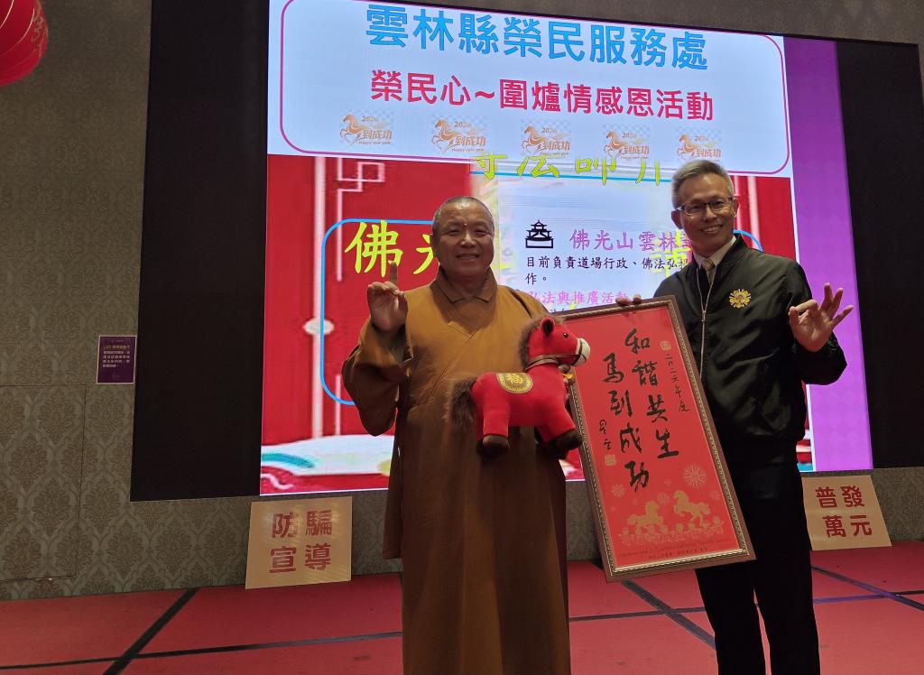 感恩餐會活動開場,由具有榮民身分佛光山雲林講堂住持慧得法師帶唱軍歌,熟悉旋律喚起榮民前輩們軍旅回憶,也在現場發放「平安富有」祝福卡;同時分發林周生老師年節春聯,邀請黃素丹老師當場彩繪年畫及高淑頃榮欣志工提供溫暖咖啡。