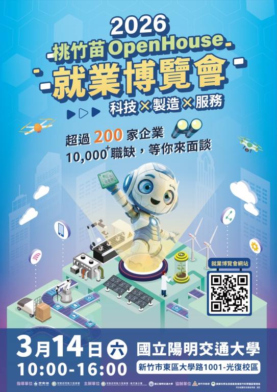 「2026 桃竹苗 OpenHouse 就業博覽會」將於 3 月 14 日在陽明交大新竹校區隆重登場。由勞動部勞動力發展署桃竹苗分署與國立陽明交通大學強強聯手,串聯 200 家以上頂尖企業,祭出逾 1 萬個優質職缺。即日起官網正式對外開放,貼心提供「產業快速檢索」與廠商精選「5 大職缺」功能,職缺重點一目了然,方便求職者預先將心儀職務加入「我的最愛」,在活動前就規劃好個人化的求職攻略,大幅提升媒合效益。