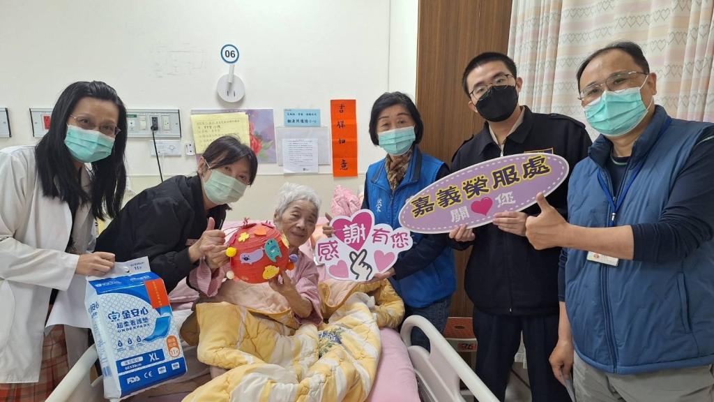 【大成報記者于郁金/嘉義報導】農曆春節將至,為表達對住院榮民長輩關懷與祝福,嘉義榮服處處長許淑菁12日上午偕同榮欣志工及替代役男,前往臺中榮民總醫院嘉義分院探視住院榮民;在嘉義分院社工室主任陳麗圓陪同下,逐一向長輩們問安致意,並致贈慰問品,提前送上節慶祝福與溫暖關懷。