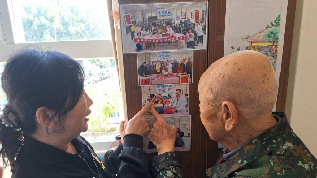 甫於1月歡度百歲壽誕鄭伯伯,也精心將榮服處為其製作百歲慶生照片張貼於病房牆上,熱情地向在場人員分享喜悅;長輩們對於榮服處一行的到訪深表感動,病房內洋溢著溫暖與歡笑。
