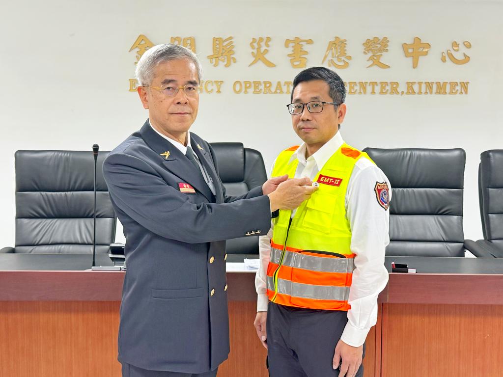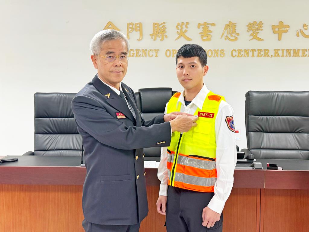 【大成報記者陳金/金門報導】金門縣消防局於近日舉行「救命之星」榮譽胸章授章儀式,表彰在到院前緊急救護勤務中表現卓越、成功挽救生命救護人員;消防局長呂英華親自頒發榮譽胸章,肯定第一線執勤人員在生死關頭展現專業技術、勇氣與責任感。