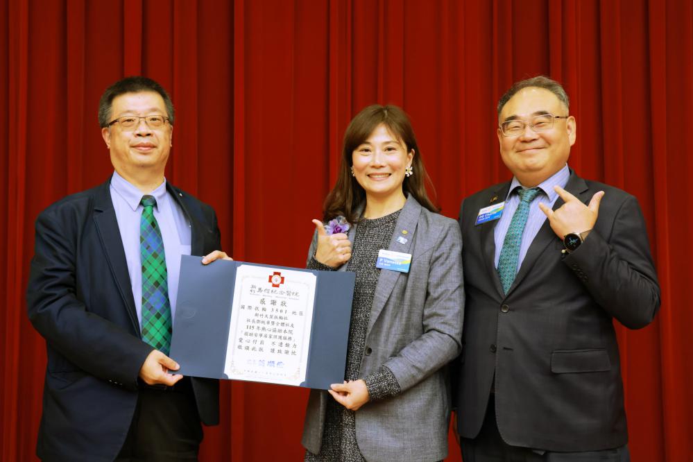▲新竹馬偕紀念醫院院長室主任蔡德龍(左)代表院方致贈感謝狀,由國際扶輪3501地區總監劉正輝(右)及主辦社新竹天翌扶輪社社長鄧純華(中)代表受贈。(圖/新竹馬偕紀念醫院提供)