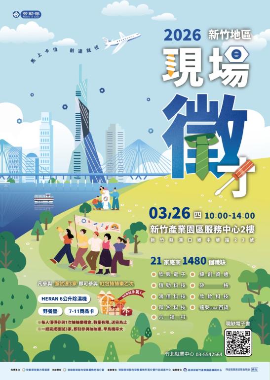 勞動部勞動力發展署桃竹苗分署將於3月26日(星期四)上午10點至下午2點,在新竹產業園區服務中心2樓(新竹縣湖口鄉中華路22號)舉辦「2026年新竹地區現場徵才活動」。此次徵才活動匯集科技製造、物流運輸與餐飲旅宿業等共計21家知名廠商,提供高達1,480個優質職缺,協助不同背景與職涯階段的求職者都能找到合適的工作。
