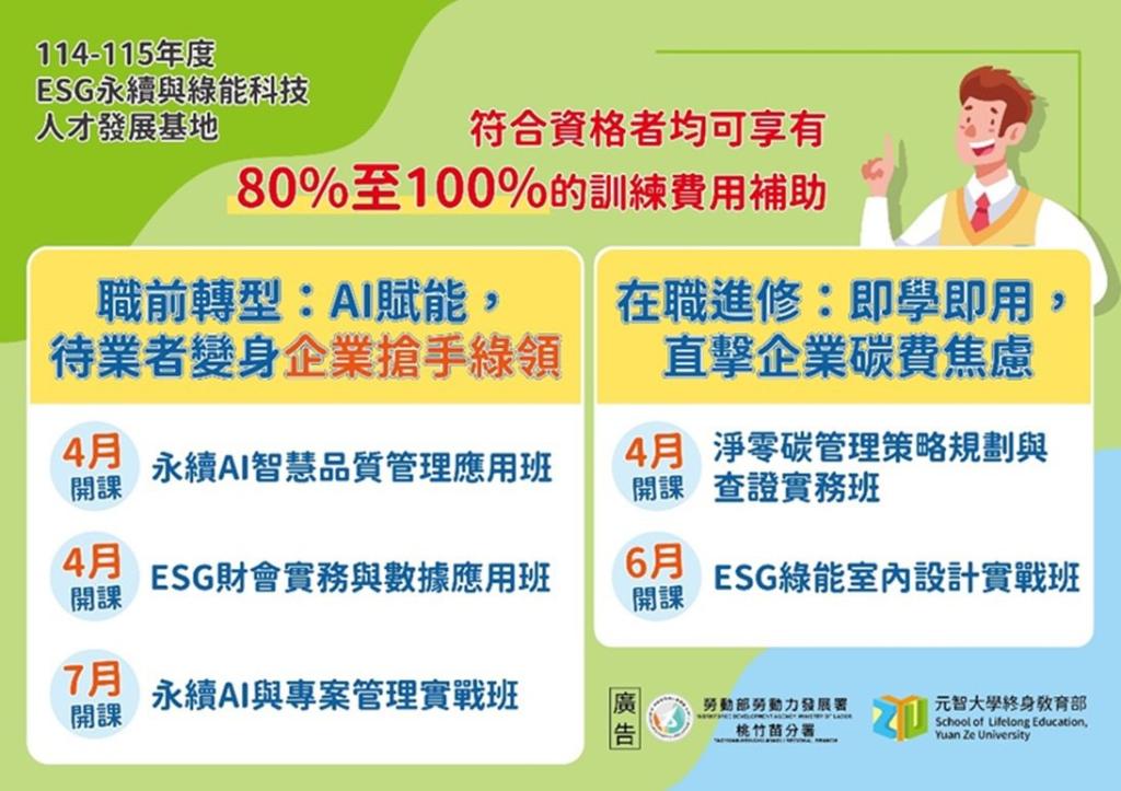 ▲桃竹苗分署與元智大學合作開課,培訓ESG科技人才,即日起報名。(圖/ 桃竹苗分署提供)