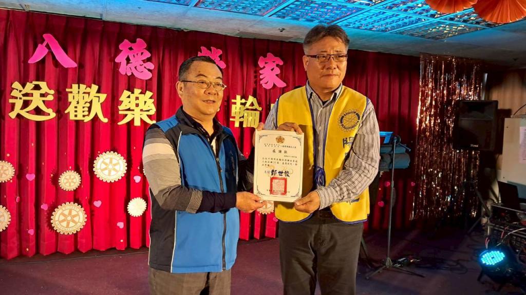 ▲八德榮家副主任程釋鋒(左)頒發感謝狀予台北陽明扶輪社代表(右),感謝慷捐物資關懷住民生活需求,並展現社會各界攜手投入公益、共同守護長者福祉的溫暖力量。(圖/八德榮家提供)