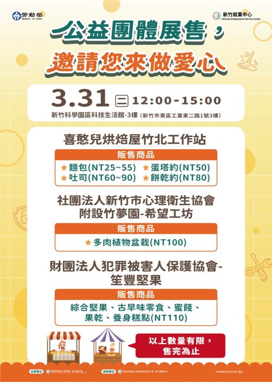 ▲桃竹苗分署3/31辦理「新竹科學園區協力廠商」聯合徵才活動,現場公益團體展售。 (圖/桃竹苗分署提供)