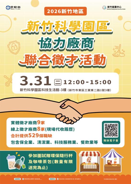 為協助新竹科學園區企業補足清潔、餐飲、保全等服務人力需求,並提供民眾多元就業機會,勞動部勞動力發展署桃竹苗分署於3月31日在新竹科學園區就業服務台舉辦辦理「新竹科學園區協力廠商」聯合徵才活動,集結17家企業釋出529個工作機會,透過現場洽談與媒合,協助求職者快速掌握就業機會。全場近8成不設學經歷門檻,且超過7成職缺於現場面試後即安排錄取,大幅縮短求職媒合時間,歡迎有意尋找工作的求職者踴躍前往面試。