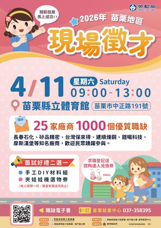 4月11日苗栗場匯集產業指標企業,以具競爭力的薪資與福利吸引人才。在地大廠長春石化釋出化工技術員50名,起薪44K以上,並提供每胎生育補助2萬元及4歲以下育兒津貼每月3000元;台灣矽科宏晟為延攬研發人才,開出最高薪資10萬元的研發工程師職缺;京元電子持續大舉招募百名工程師及技術員,除分紅制度外,另提供免費醫療與法律諮詢及專屬按摩服務。此外,萬安保全針對銅鑼科學園區誠徵100名安檢員,起薪達4萬3千元,全聯實業、新苗汽車、泰安觀止溫泉及中興保全等服務業者,亦提供穩定薪資、完整福利與完善教育訓練,滿足不同求職需求。
