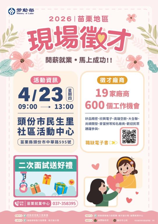 為協助失(待)業民眾儘速就業,勞動部勞動力發展署桃竹苗分署將於4月在苗栗地區辦理2場次現場徵才活動,共邀請44家企業,釋出近2,000個工作機會。首場徵才於4月11日在苗栗縣立體育館(苗栗市中正路191號)舉行,第二場則於4月23日在頭份市民生里社區活動中心(頭份市中華路595號)登場,兩場徵才活動涵蓋多元產業與職類,誠摯邀請有求職需求的民眾踴躍參加,把握轉職與就業機會。