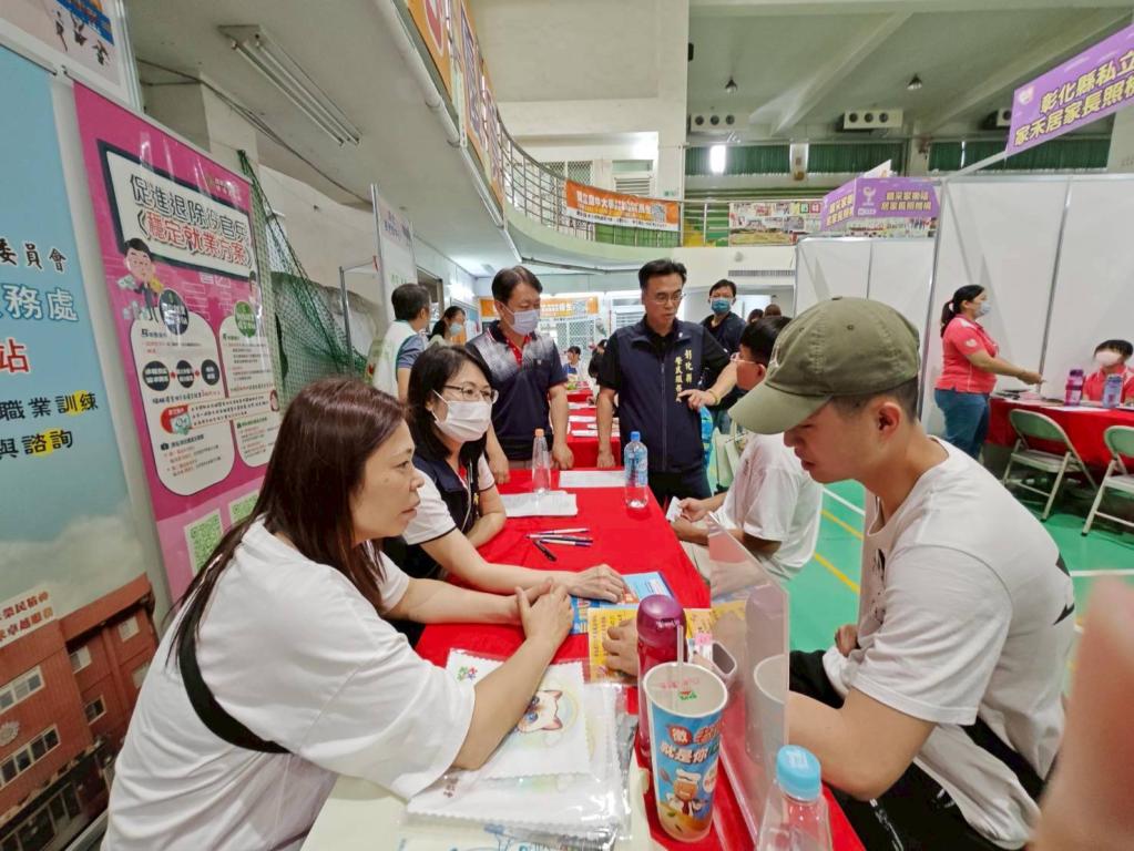 彰化縣榮服處蘇副處長參加開幕儀式後,在就業站同仁陪同下,拜會現場參與徵才活動廠商,為榮民眷開拓新工作機會,並為現場求職退除役官兵加油打氣,祝福求職順利,鼓勵退除役官兵把握現場面試機會。