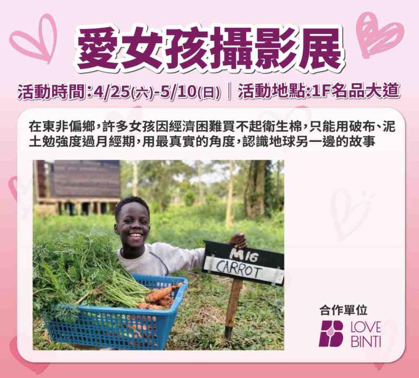 除了購物回饋外,新竹SOGO今年更進一步透過策展深入女性關懷公益議題,在4月25日起至母親節於1F名品大道展出「愛女孩攝影展」,透過實地影像紀錄東非偏鄉女孩,因貧困面臨生理用品不足所帶來的各種生活困境,同時舉辦布衛生棉DIY活動,讓民眾在節慶購物之餘,也能以實際行動支持地球另一半的女孩們。另外,業者於母親節當天邀請新竹國小直笛隊,於1F活動區將帶來溫馨組曲,陪伴民眾在輕柔樂聲中感受節慶氛圍與親情溫暖。