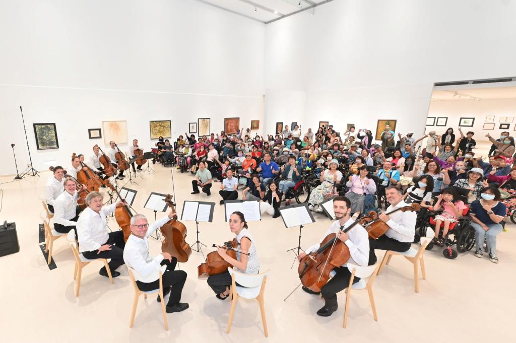 【大成報記者張淑慧/高雄報導】中鋼集團教育基金會(以下簡稱中鋼基金會)攜手弦外之音團藝術總監、知名大提琴家張正傑老師,共同策劃一場特別音樂會,邀請國際知名音樂團體「柏林愛樂12把大提琴」於今(7月16日)下午在高雄市立美術館(以下簡稱高美館)舉行,專為輪椅族朋友獻上多首耳熟能詳的優美樂曲。高雄市社會局副局長葉欣雅、高美館代理館長林羿妏、中鋼基金會執行長黃一中,以及知名藝術家李德之子李太楓與夫人親臨現場,與近百位輪椅族朋友一同感受這場充滿愛與感動的世界級音樂盛宴。