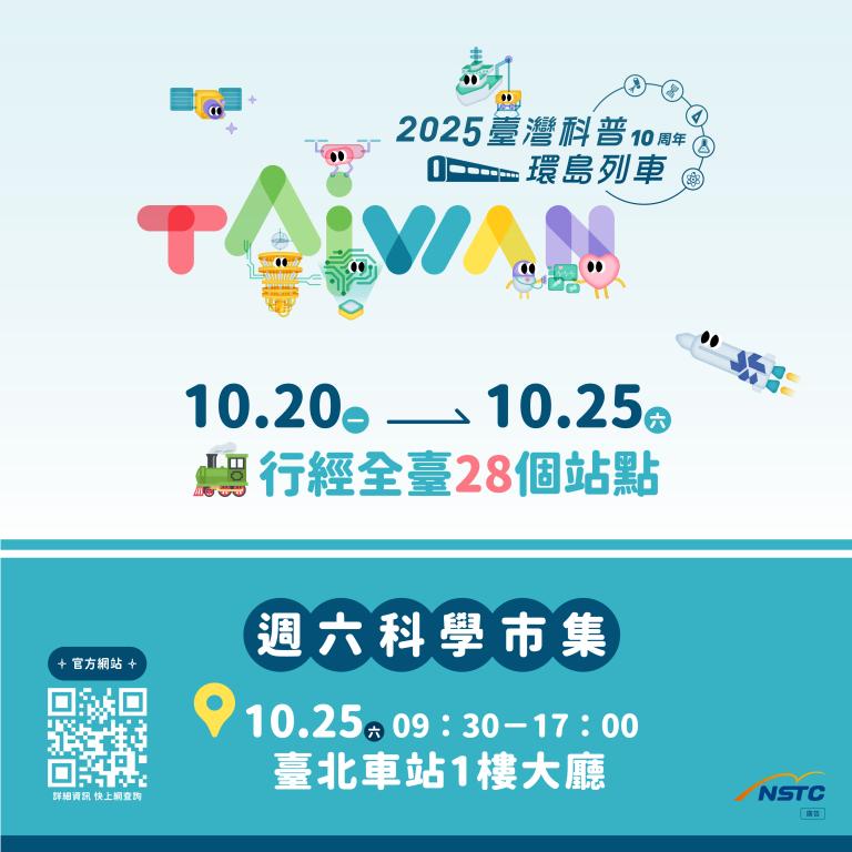 2025臺灣科普列車環島期間將串聯各地火車站與在地特色活動,讓全民透過實驗互動與科學市集感受探索的樂趣,10月25日列車將回到臺北車站舉辦整天科學市集,邀請民眾一同參與,體驗科學的奧妙與感動!