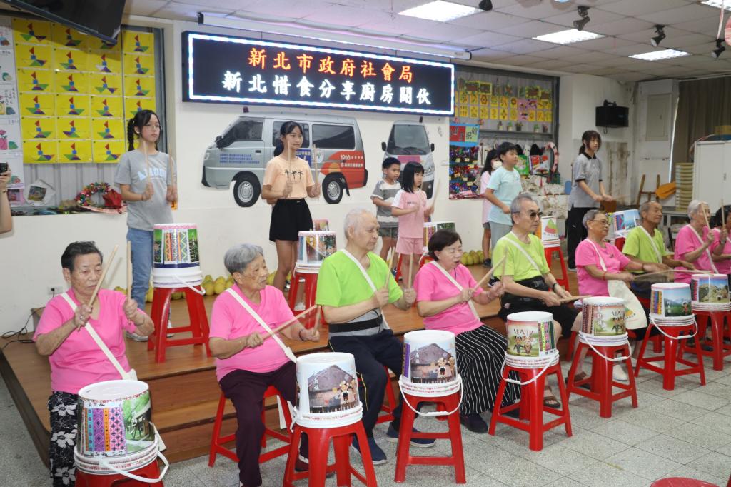 圖說:牡丹心社區長輩和小朋友在共餐前利用水桶鼓敲打演奏瀟灑走一回。