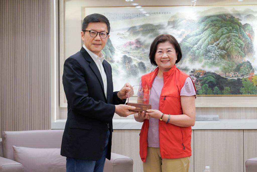 圖說:新北市準提佛母慈善會成立不到一年時間,集眾人之力捐贈復康巴士,17日由新北市副秘書長張其強(左)代表受贈,並向理事長蕭英修(右)表達感謝。