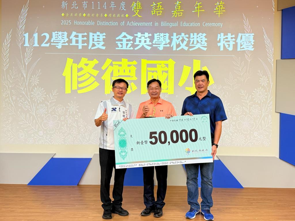 榮獲「金英學校特優」的修德國小完整規劃雙語生活與綜合課程地圖,校長陳俊生表示,感謝「英魂不散」團隊的堅持與熱情,讓修德的孩子在雙語課堂中展現自信風采、勇敢逐夢。