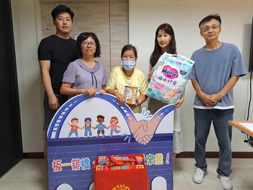 圖說:社會局副局長許秀能(左2)代表贈送奶粉、尿片給幼兒曾祖母 左1為「隱慈善會」理事長陳書玄 右1、2為板橋第一社福中心督導陳慶家和主責社工姜延蓉。