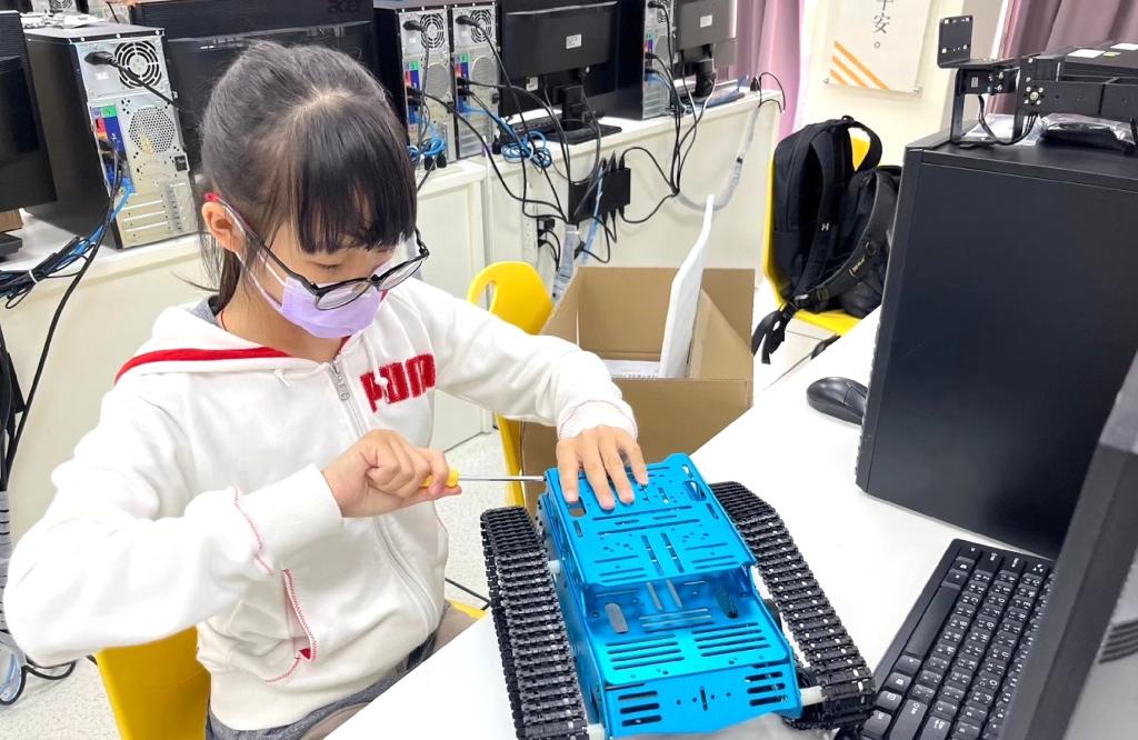 圖說:學生專注組裝輪型機器人,培養動手實作與科技創新能力。