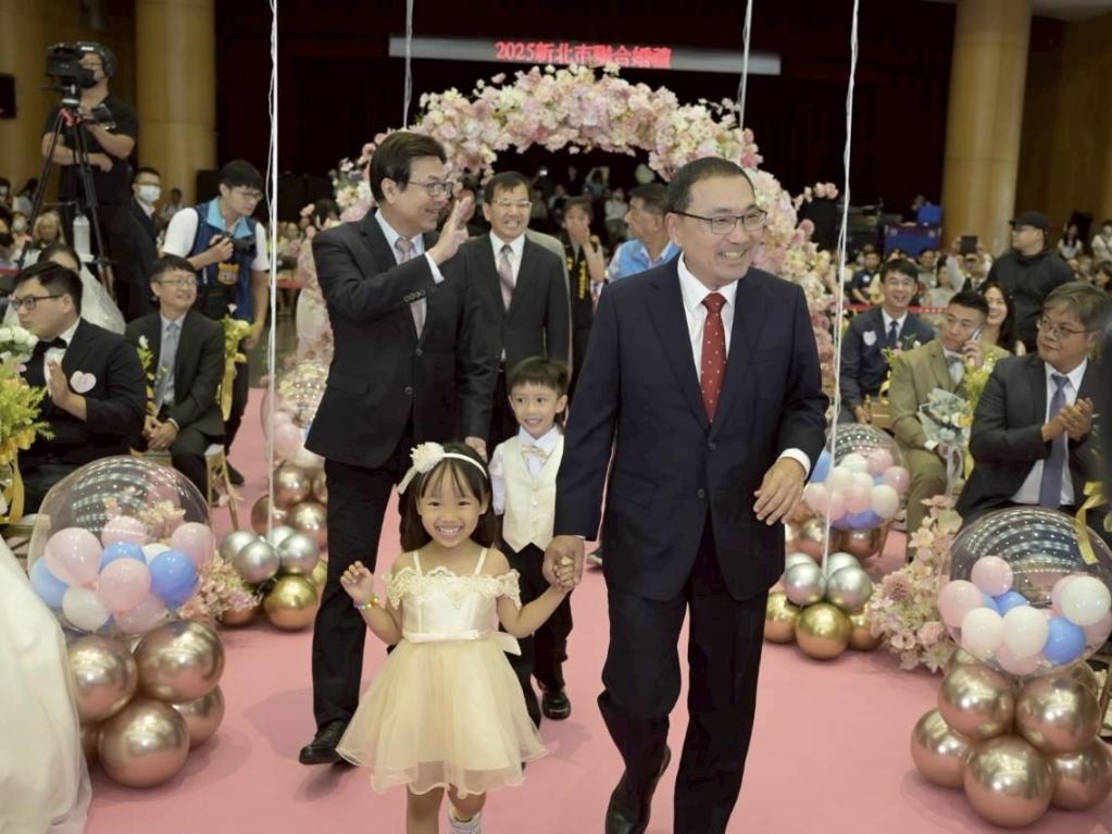 圖說:今天(19)日市長侯友宜、副市長劉和然和花童們一同入場,象徵幸福啟程,為2025新北聯合婚禮揭開浪漫序幕。