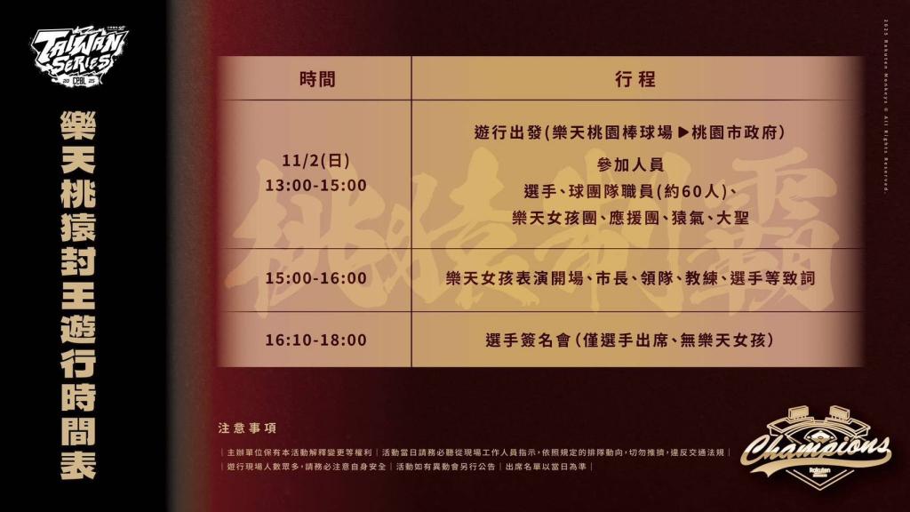 【大成報記者袁慧心/桃園報導 】 為慶祝桃園市樂天桃猿隊以4勝1敗力克中信兄弟,奪得中華職棒36年總冠軍,於11月2日(週日)下午1點舉行樂天桃猿封王遊行暨簽名會,車隊將從樂天桃園棒球場出發,繞行桃園市區後抵達桃園市府廣場,並在下午4點至6點舉行選手簽名會,與球迷一同歡慶奪冠喜悅。