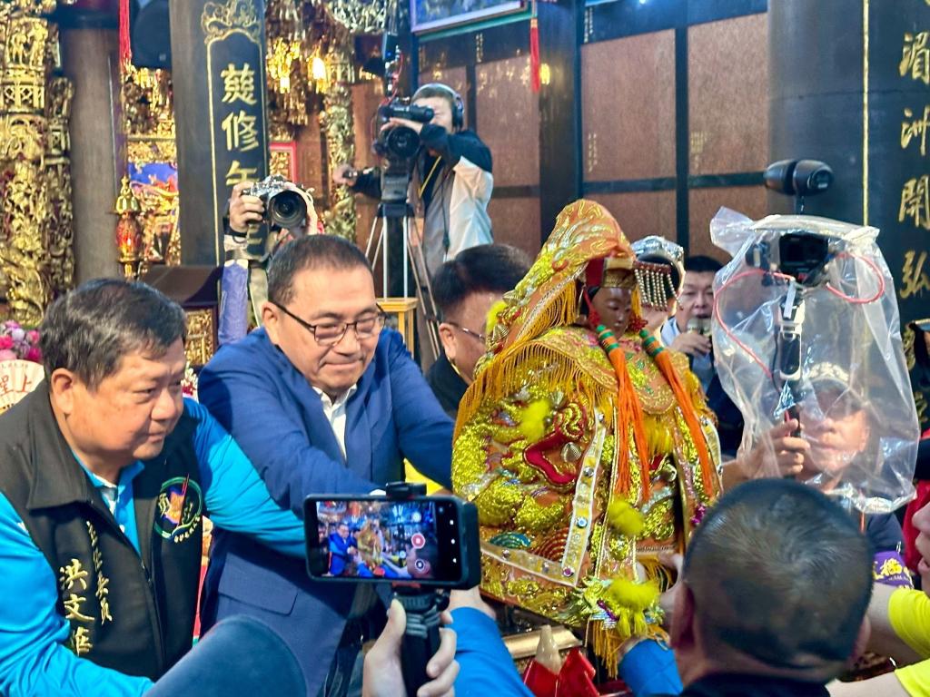 圖說:新北市長侯友宜(左2)、板橋慈惠宮主委賴春穆(左3)及苗栗白沙屯拱天宮主委洪文華(左1)一同恭請拱天宮天上聖母三媽上轎。
