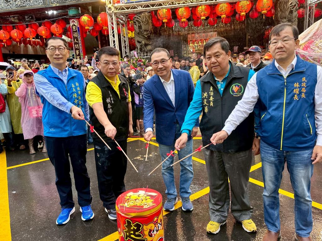 圖說:新北市長侯友宜(左3)、板橋慈惠宮主委賴春穆(左2)、苗栗白沙屯拱天宮主委洪文華(右2)、民政局長林耀長(右1)、板橋區長陳奇正(左1)一同點為百年會香的祈福踩街活動點燃起馬炮。