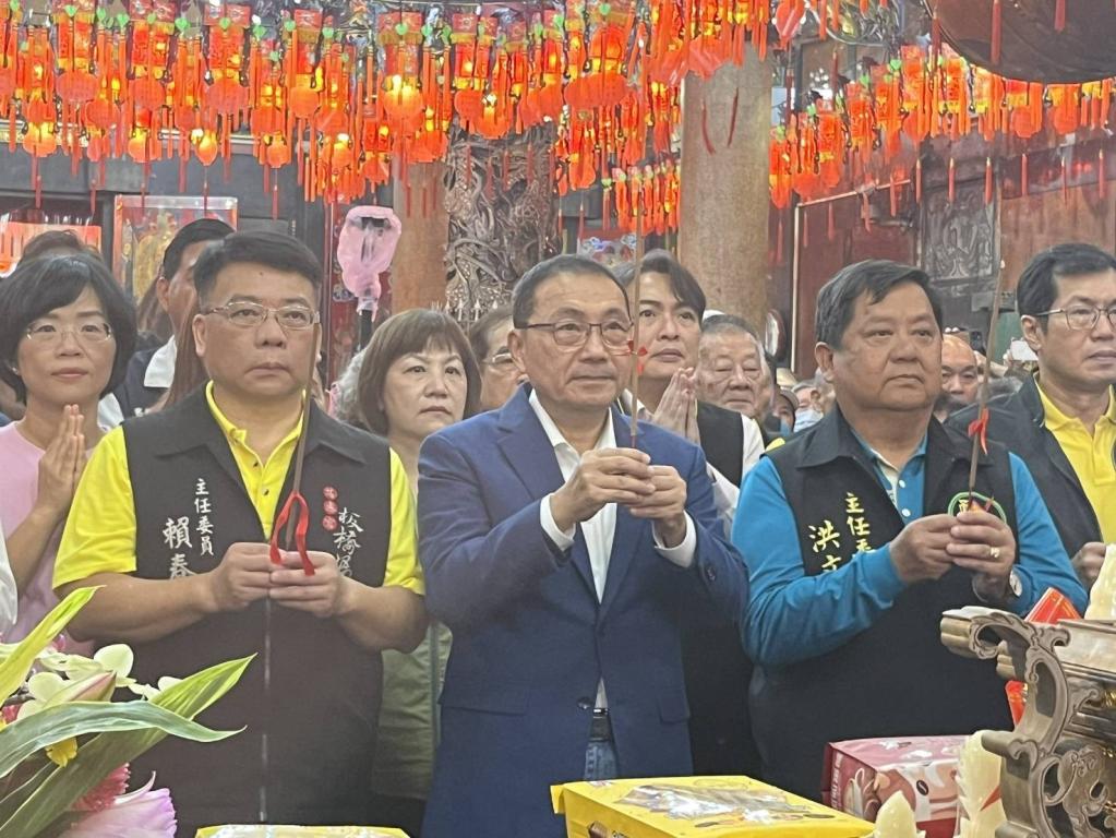 圖說:新北市長侯友宜(左2)在板橋慈惠宮主委賴春穆(左1)及苗栗白沙屯拱天宮主委洪文華(左3)的陪同下參拜祈福。
