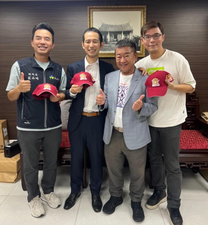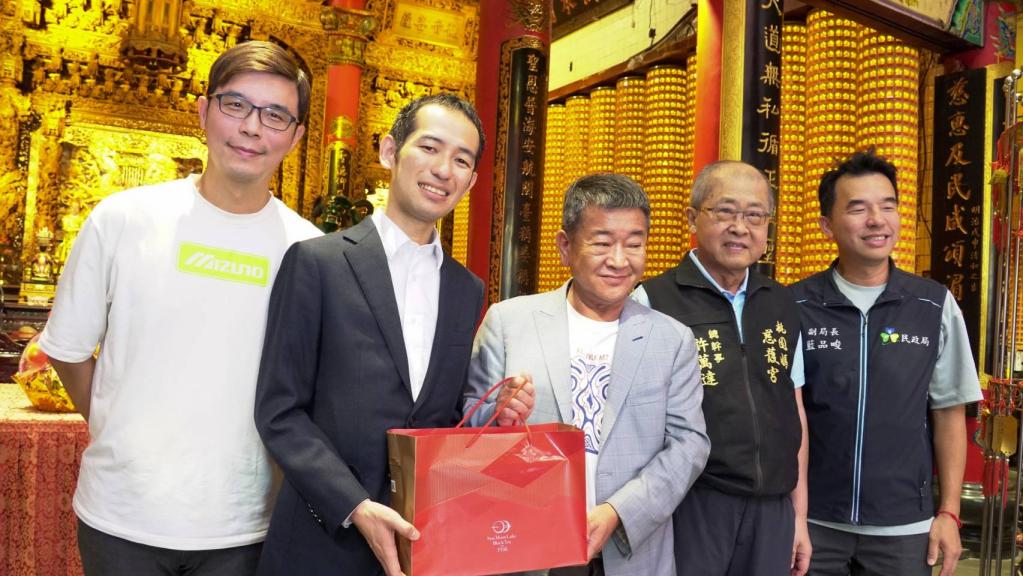 簡征潭主委在交換禮物時,特致贈給「雙媽會」奪冠後,慈護宮新文創品「桃園媽」棒球帽,以及原文創品「金運桶」,牧野幸輝等人愛不釋手,給予「桃園媽」棒球帽高度評價。