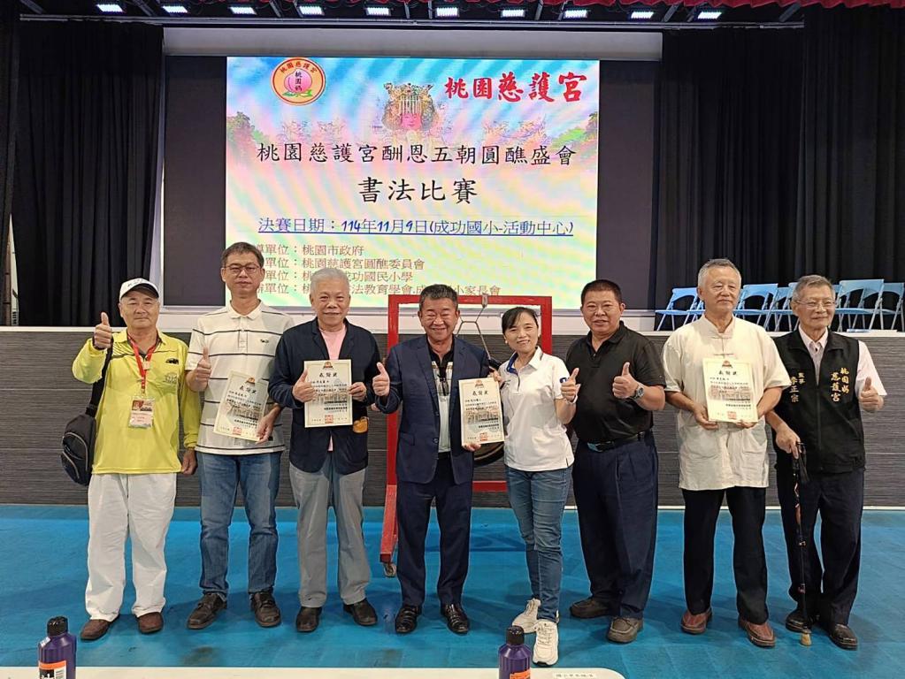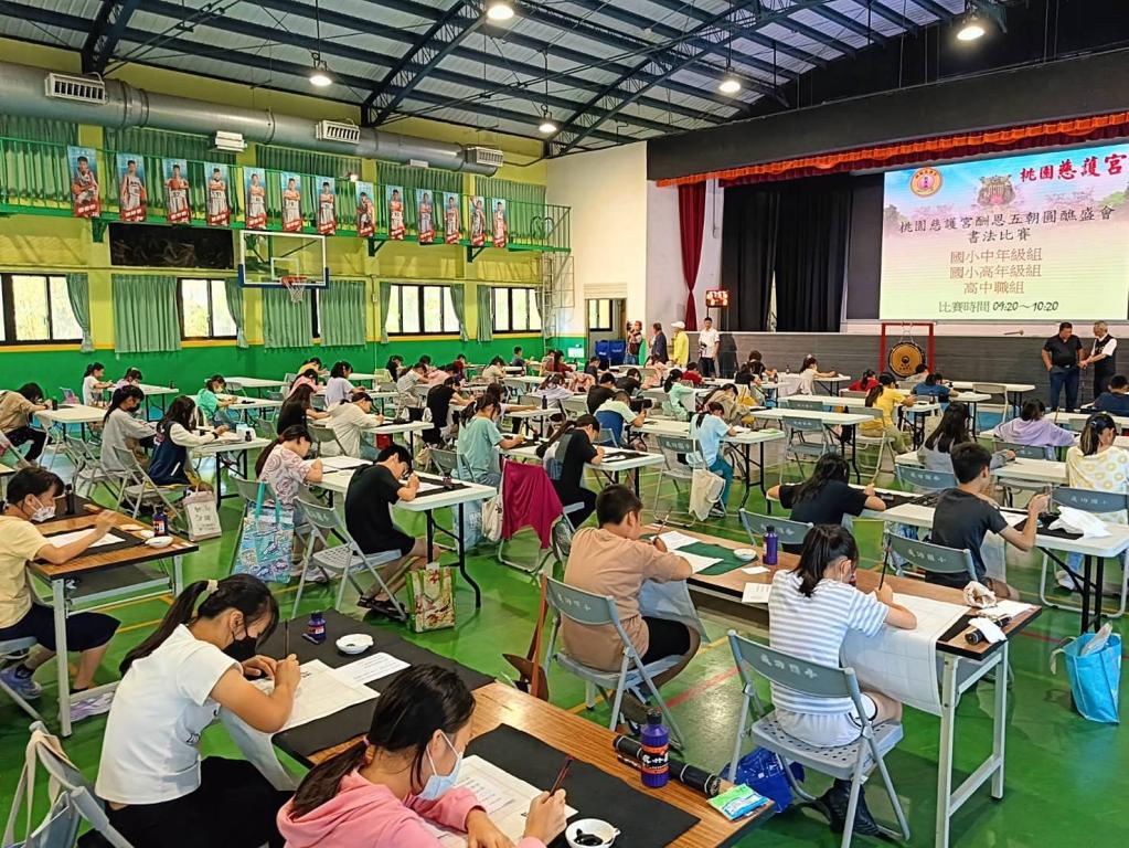 【大成報記者袁慧心/桃園報導】桃園慈護宮九日上午在成功國小舉辦書法比賽活動,慈護宮主任委員簡征潭表示,這是慈護宮酬恩五朝圓醮系列活動之一,八日舉辦的廟埕寫生獲得民眾熱烈回響,九日書法比賽,也是為了宏揚媽祖宗教信仰,發揚中華傳統文化,為記錄酬恩桃園慈護宮乙巳年圓醮盛況,並傳承書法國粹,提倡正當休閒藝術傳習活動。