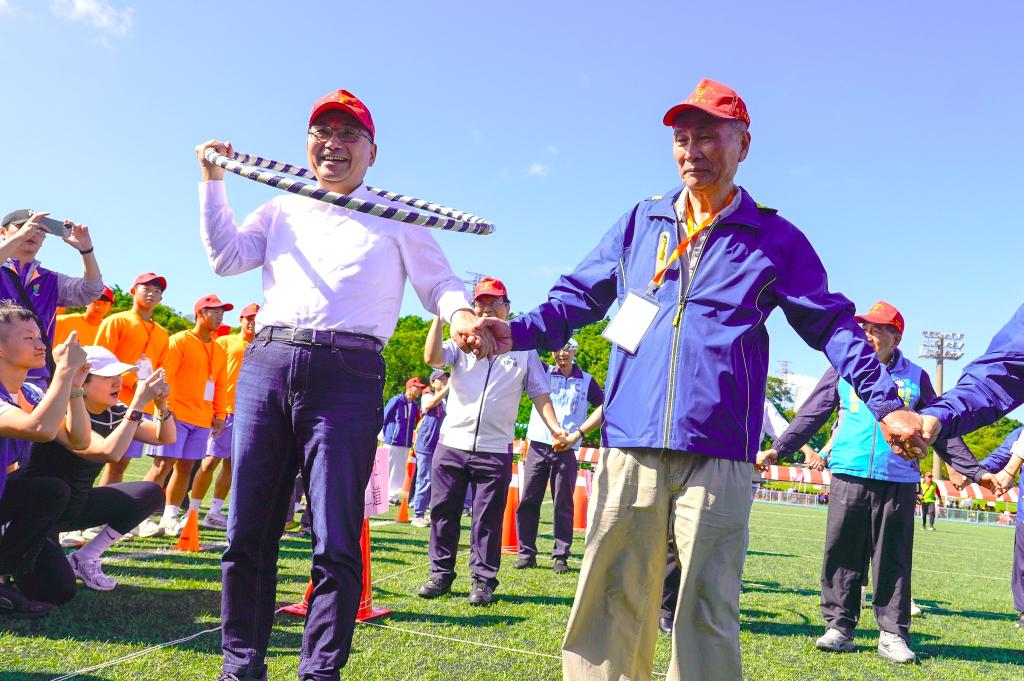 圖說:新北市長侯友宜(左)與新北市老人福利聯盟理事長陳金鐘(右)等人也加入挑戰趣味賽。