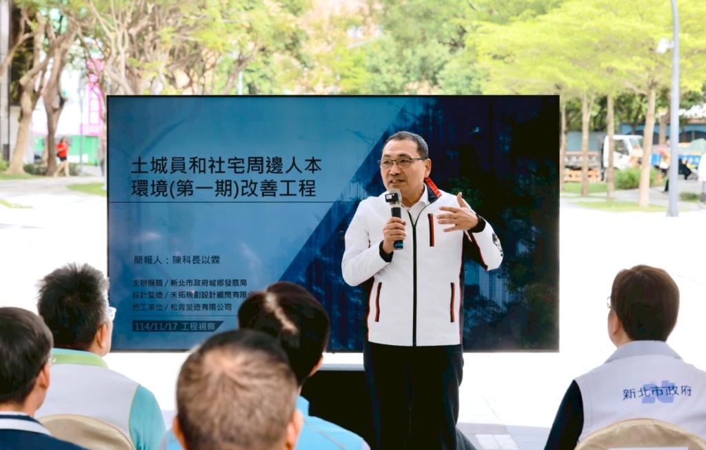 (大成報記者張玉玲/新北報導)新北市政府持續推動友善步行環境建設,今(17)日侯友宜市長前往視察「土城員和社宅周邊人本環境改善工程」,關心工程進度並與地方民意代表及施工團隊交流,員和人本通行改善工程主要為改善土城暫緩重劃區及員和社宅(自行興建534戶及容積捐贈135戶)至海山捷運站間通廊,市府規劃改善海山捷運廣場、提升綠化及優化人行道,打造舒適友善的開放廣場及安全往返捷運及社宅間步行環境,目前工程進度已逾93.7%,預計年底完工。