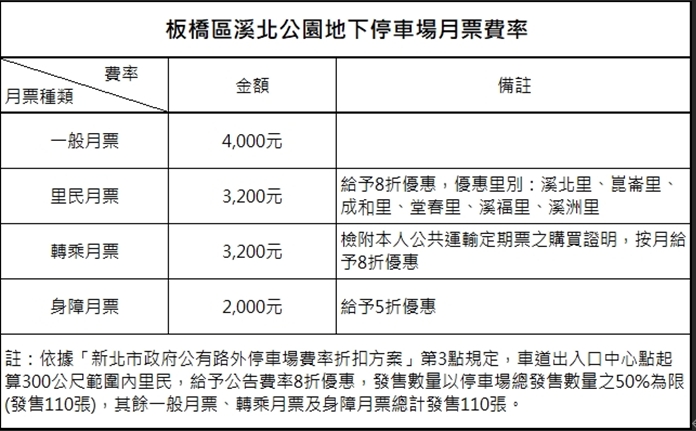 交通局表示,溪北公園地下停車場自今晚18時起試營運至12月19日止,開放免費停車,12月20日起正式收費營運。臨停費率汽車每小時30元、機車每次20元;同時有汽車月票220張、每張4,000元,機車月票35張、每張300元,月票抽籤辦法詳見附表並另已公告於交通局網站,歡迎有停車需求的市民朋友多加利用。