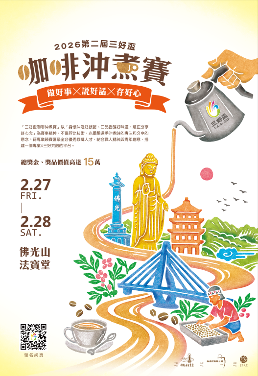 「2026第二屆三好盃咖啡沖煮賽暨佛光好事集-啡揚高屏・香聚三好」公益活動將於下月正式開放報名,比賽日期分為社會組2026年2月27日及學生組2026年2月28日,相關資訊將於官網公布。主辦單位也邀請高雄市農業局及屏東縣政府原民處推薦優質咖啡小農,於活動期間在現場設立公益攤位。這場活動將成為南台灣年度咖啡盛會,備受期待。